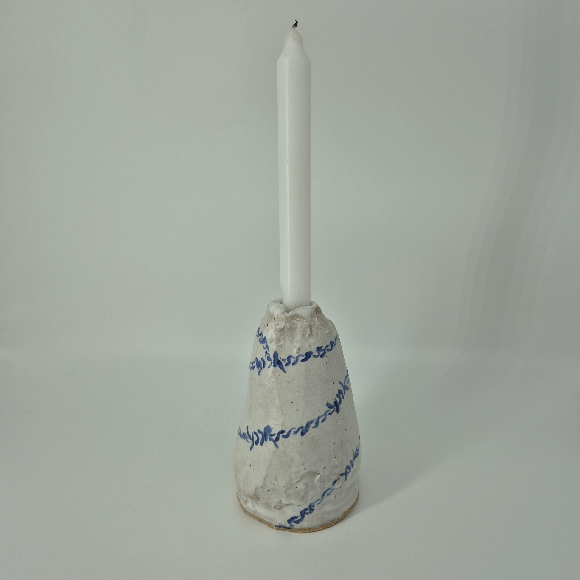 This ceramic two-in-one is great for a surprise bunch of flowers or for turning weeknight dinner into candle-lit date night! Hand built with a white raku clay and finished in a white matte glaze with hand-painted cobalt barbed wire.