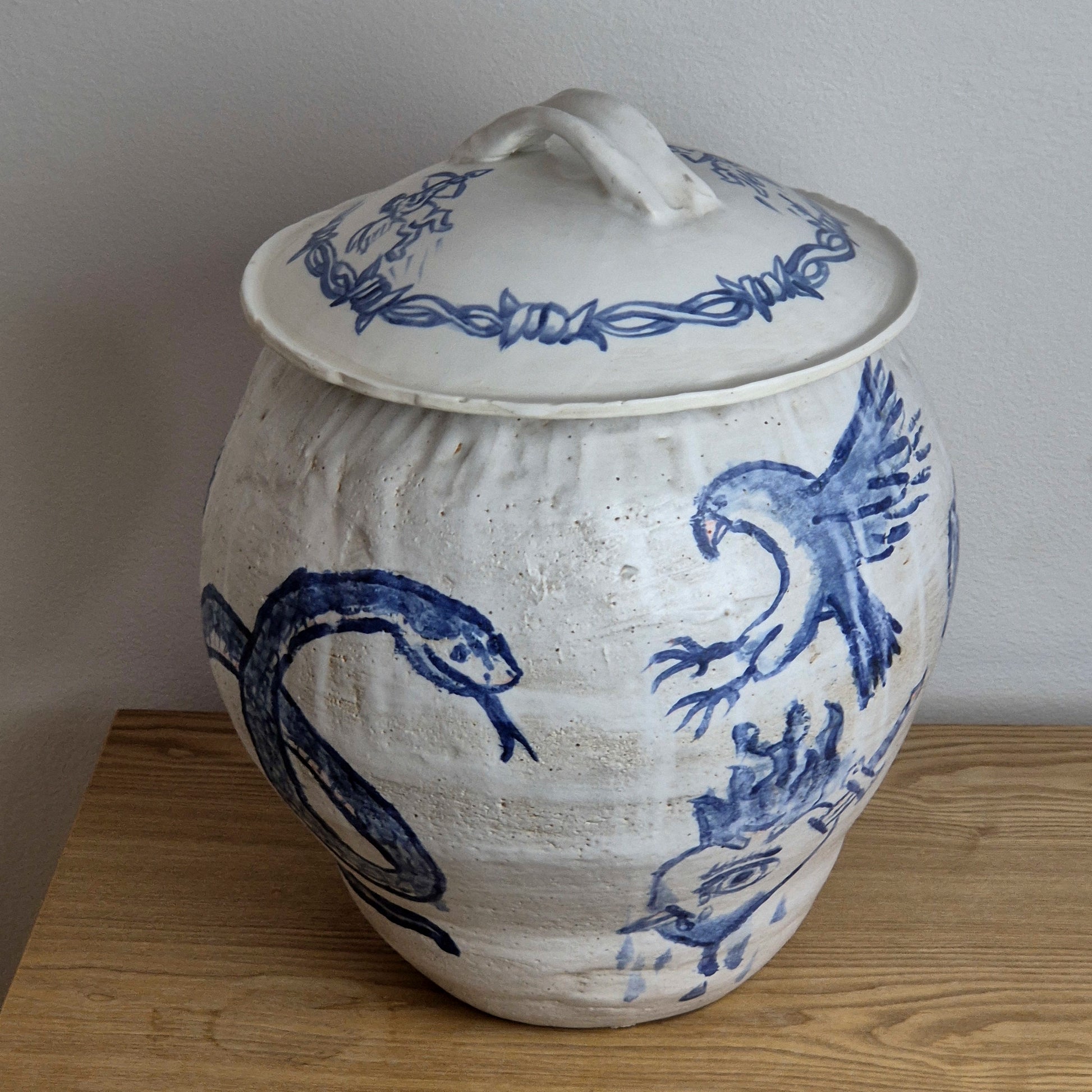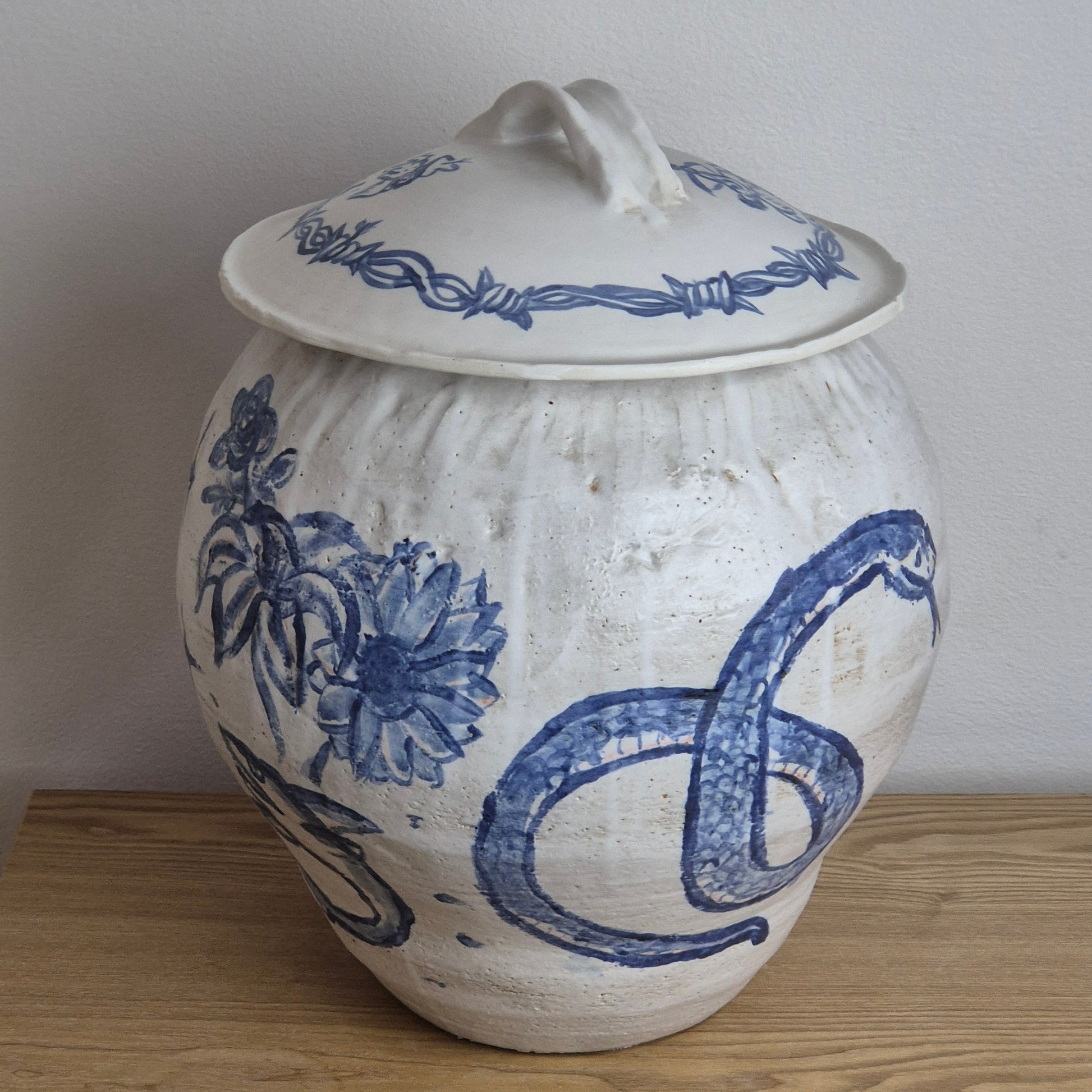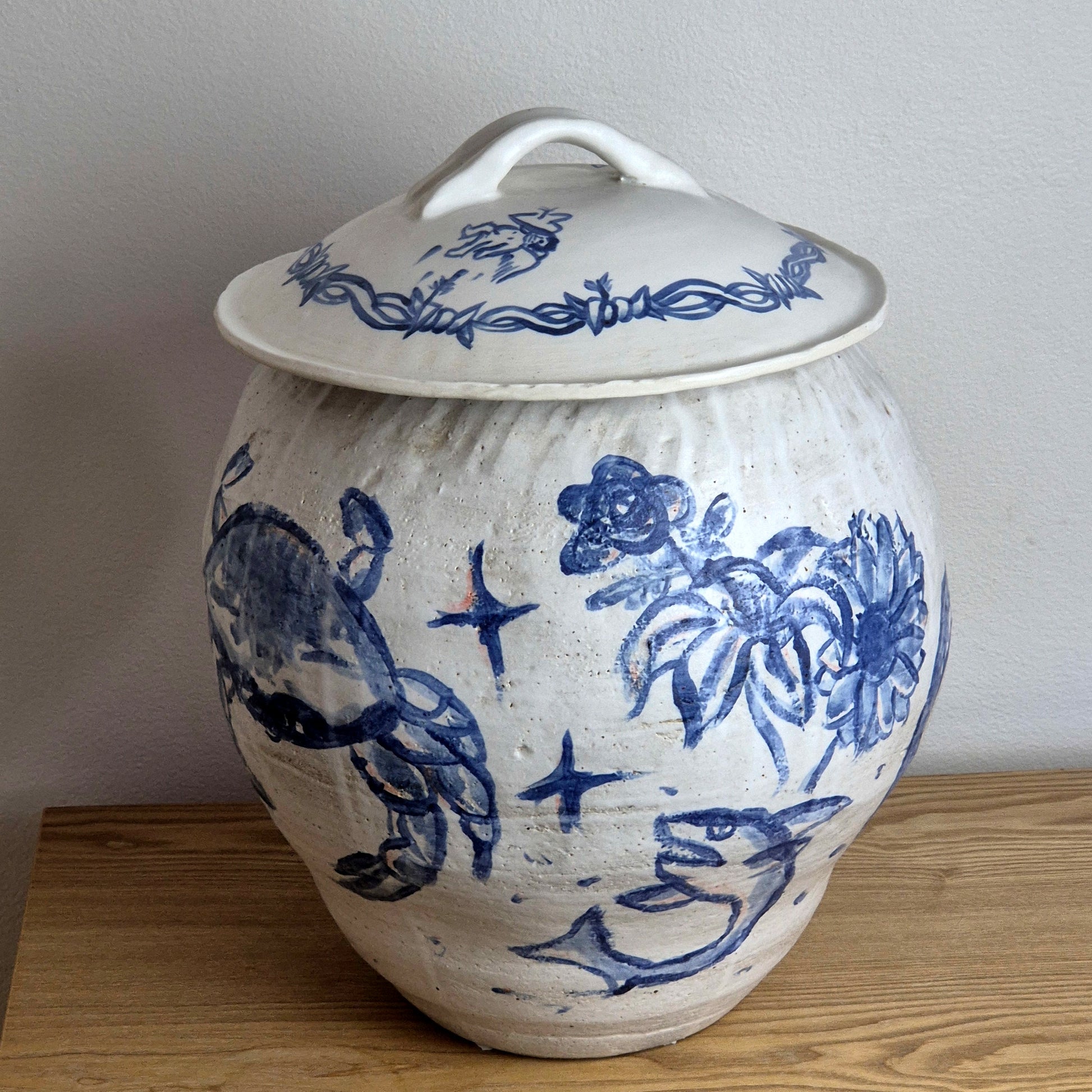 A handbuilt lidded vessel, littered with cobalt illustrations from my mind. A celebration of crab curry, supermarket flowers, love in pain, and much more. Finished with a matte white glaze and topped with a domed lid to keep the spiders trapped inside.