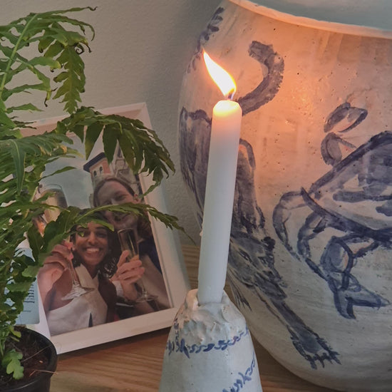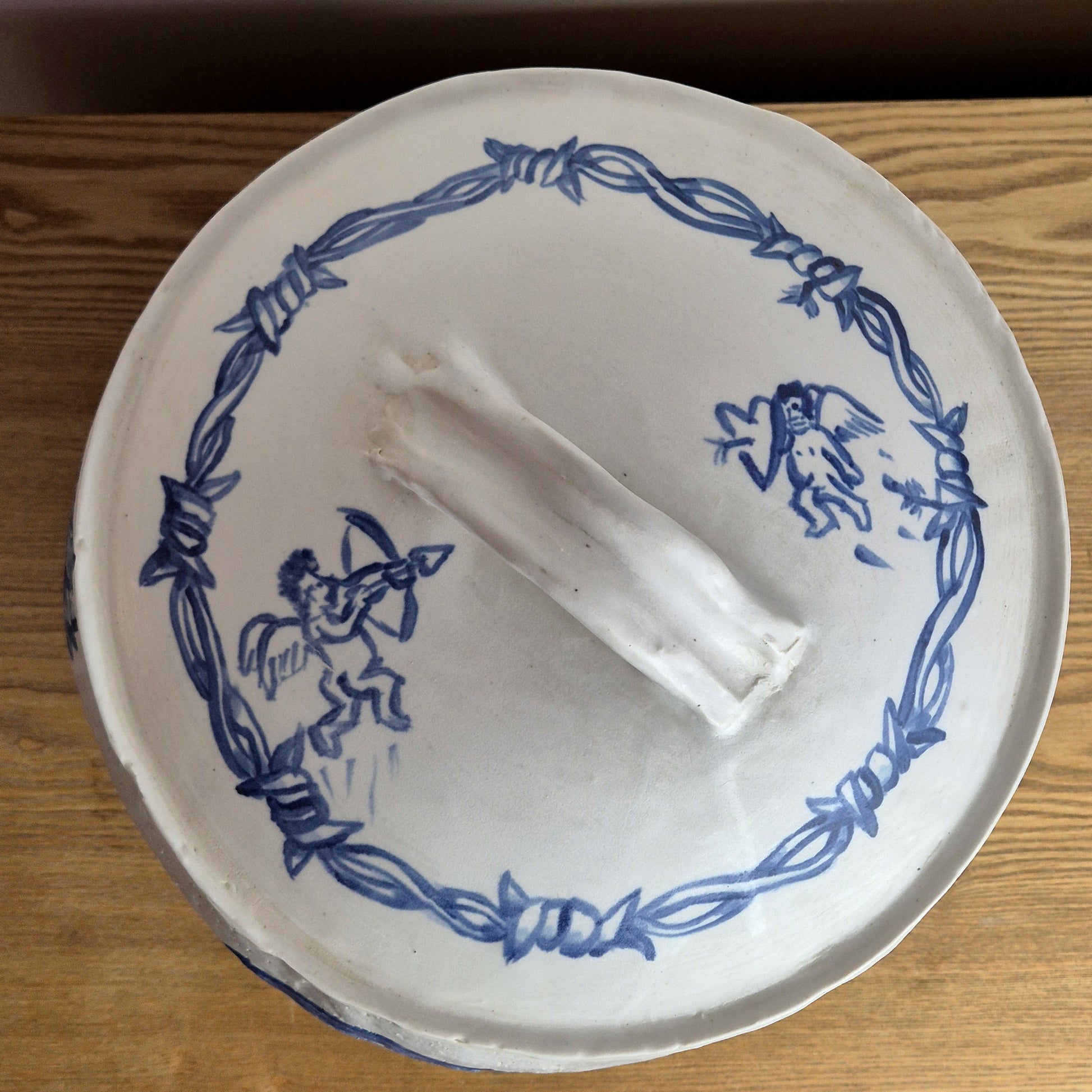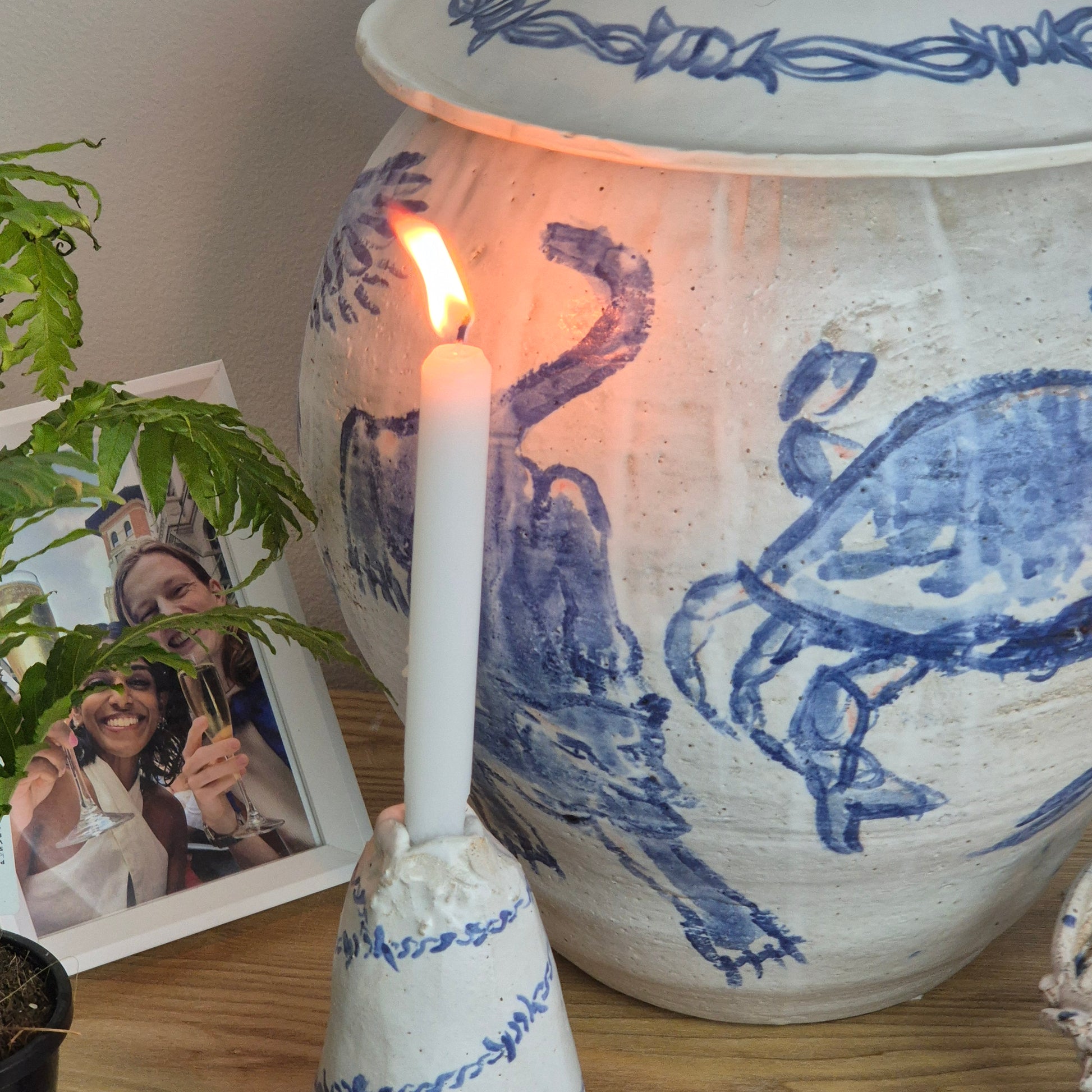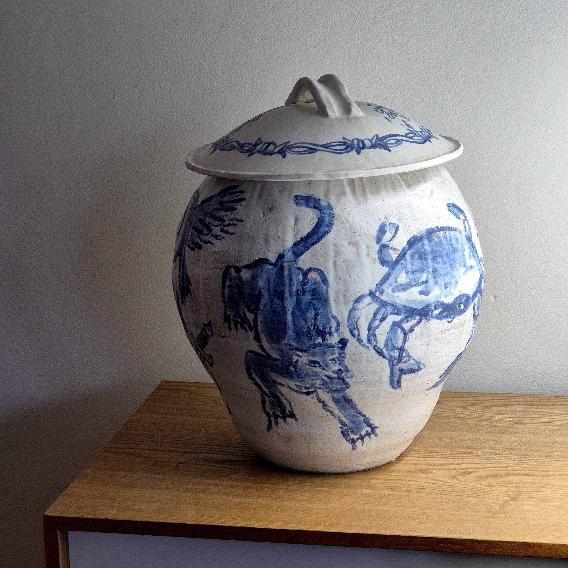 A handbuilt lidded vessel, littered with cobalt illustrations from my mind. A celebration of crab curry, supermarket flowers, love in pain, and much more. Finished with a matte white glaze and topped with a domed lid to keep the spiders trapped inside.