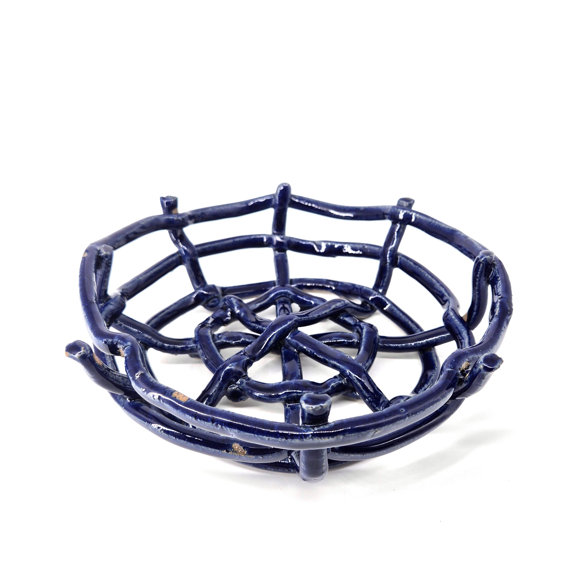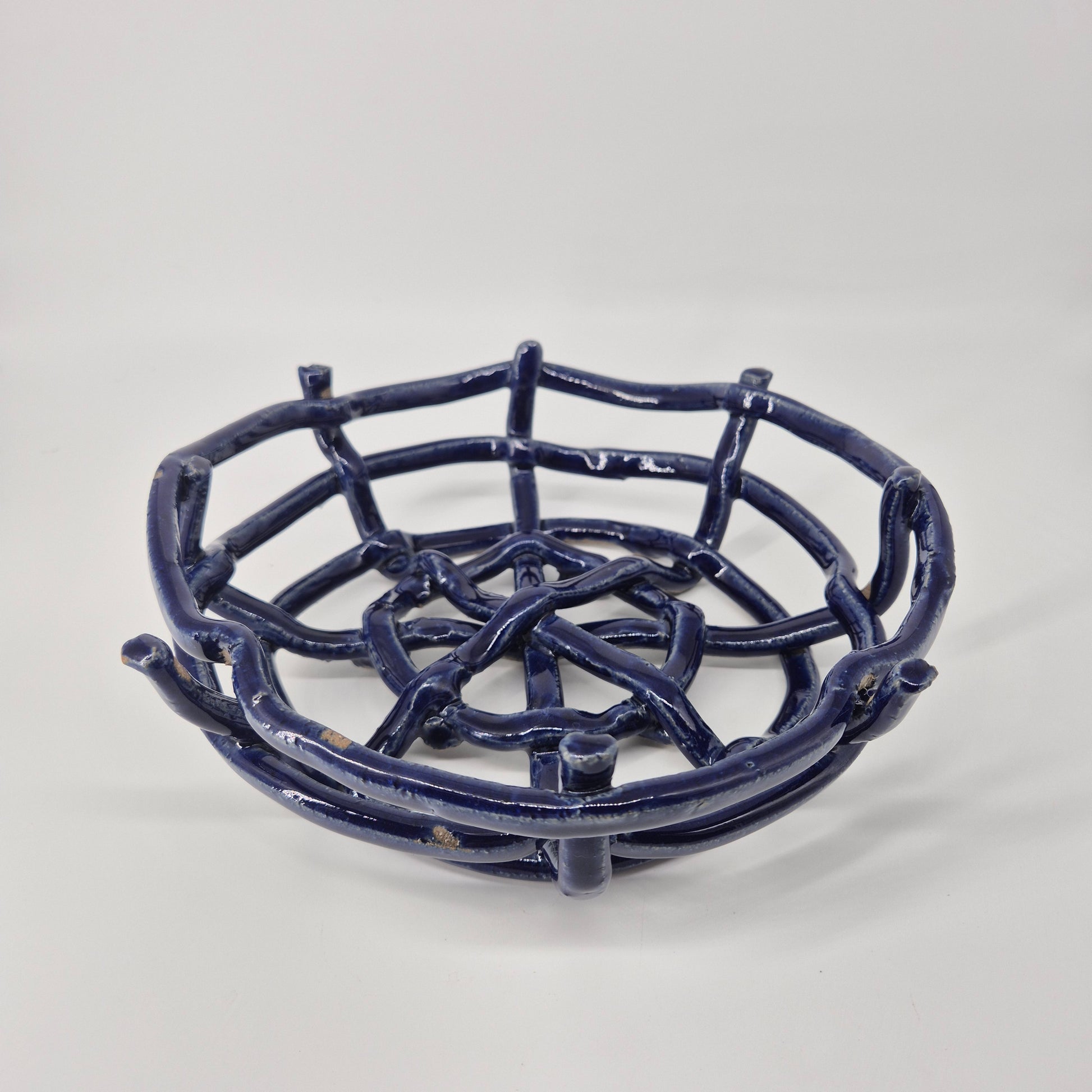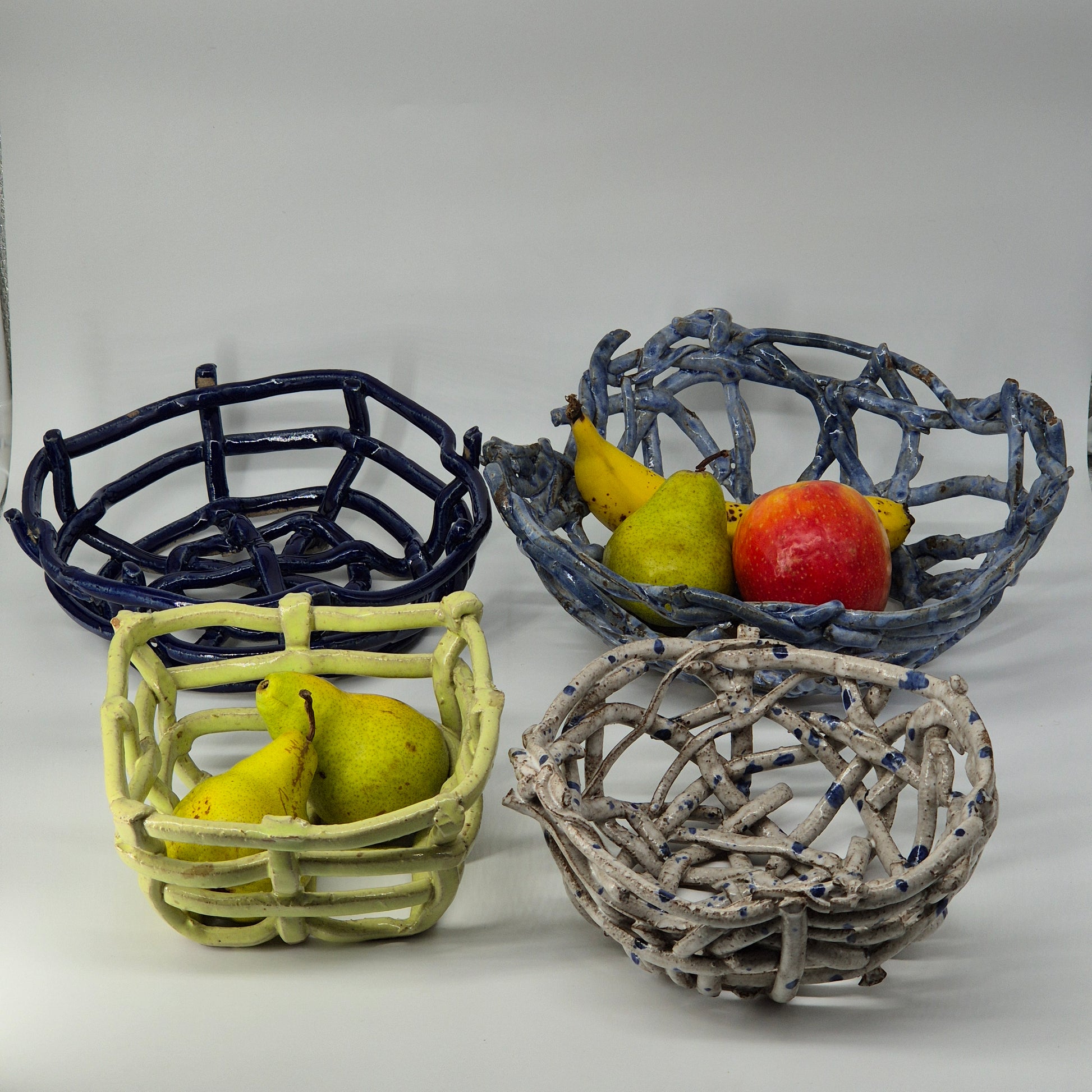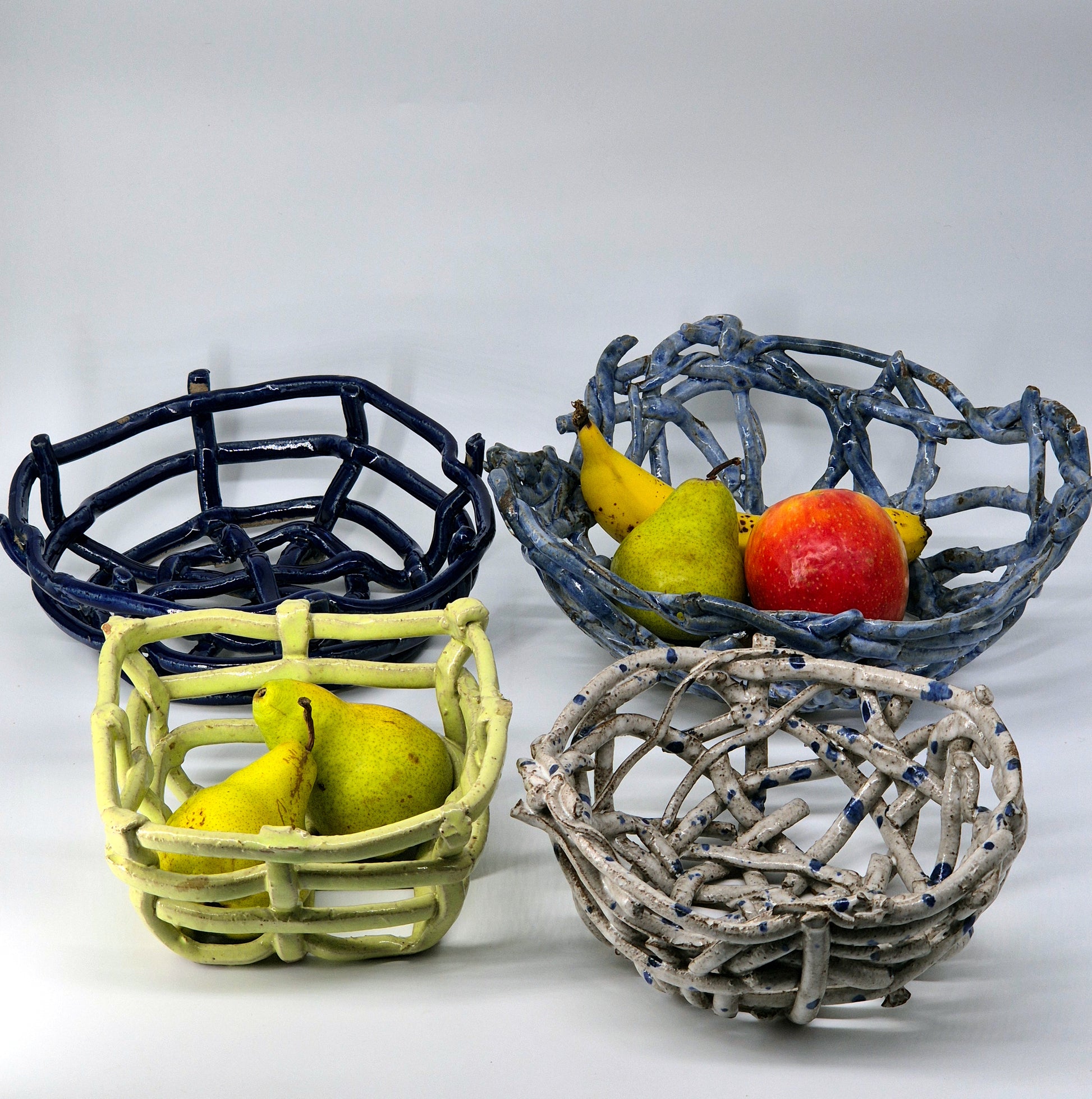 These fruit baskets are inspired by natural forms, including bird's nests and spider's webs. The open design allows for air to flow and keep fruit fresh for longer. Additionally, this design blends the colours of the ceramic with that of the fruit.