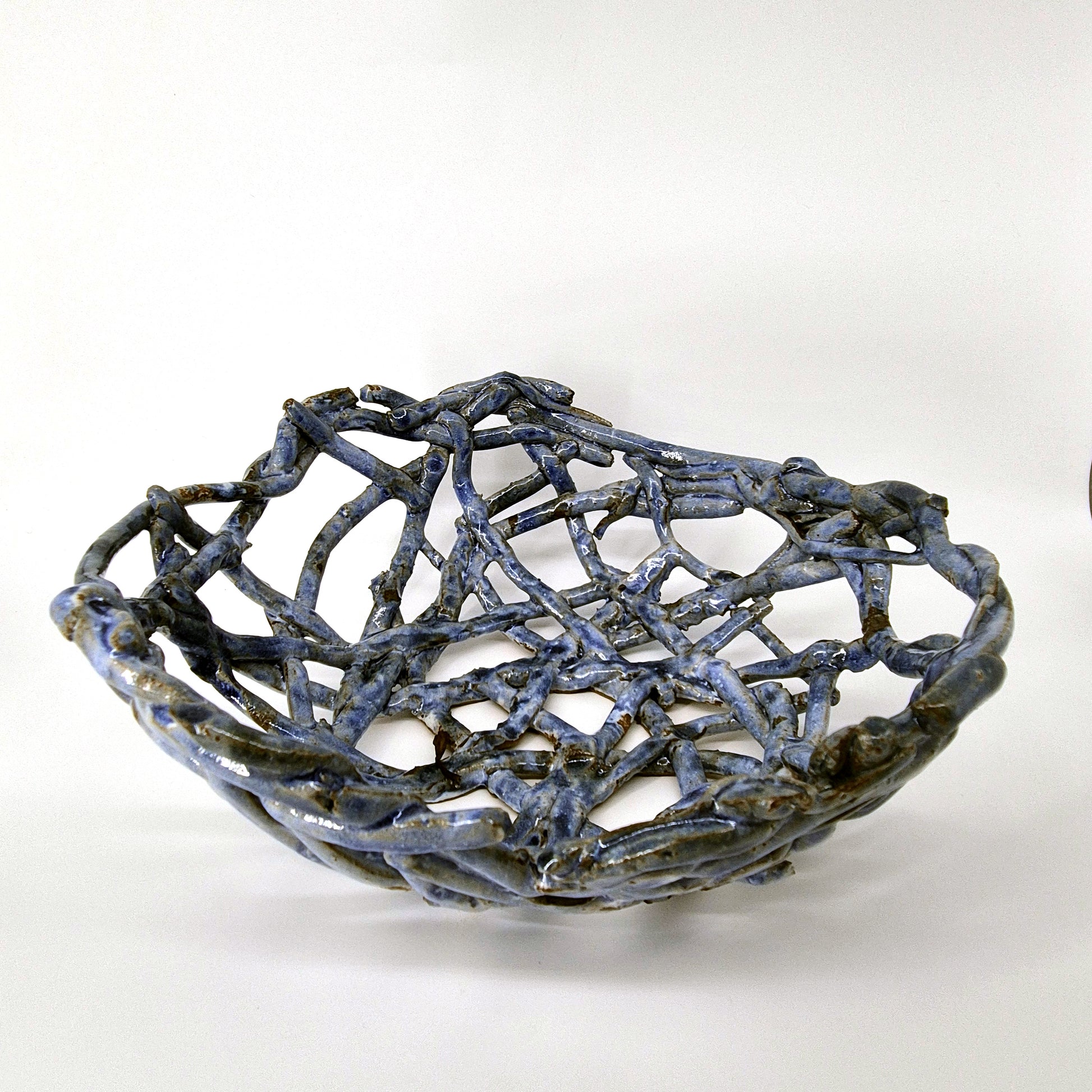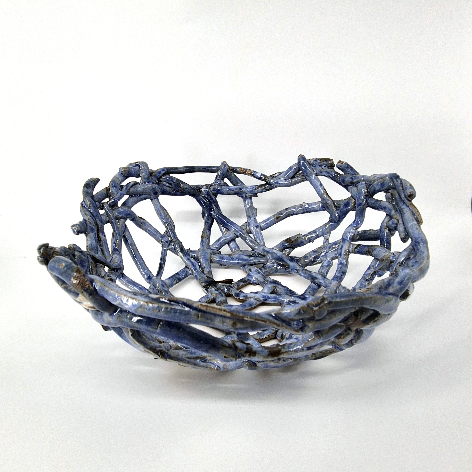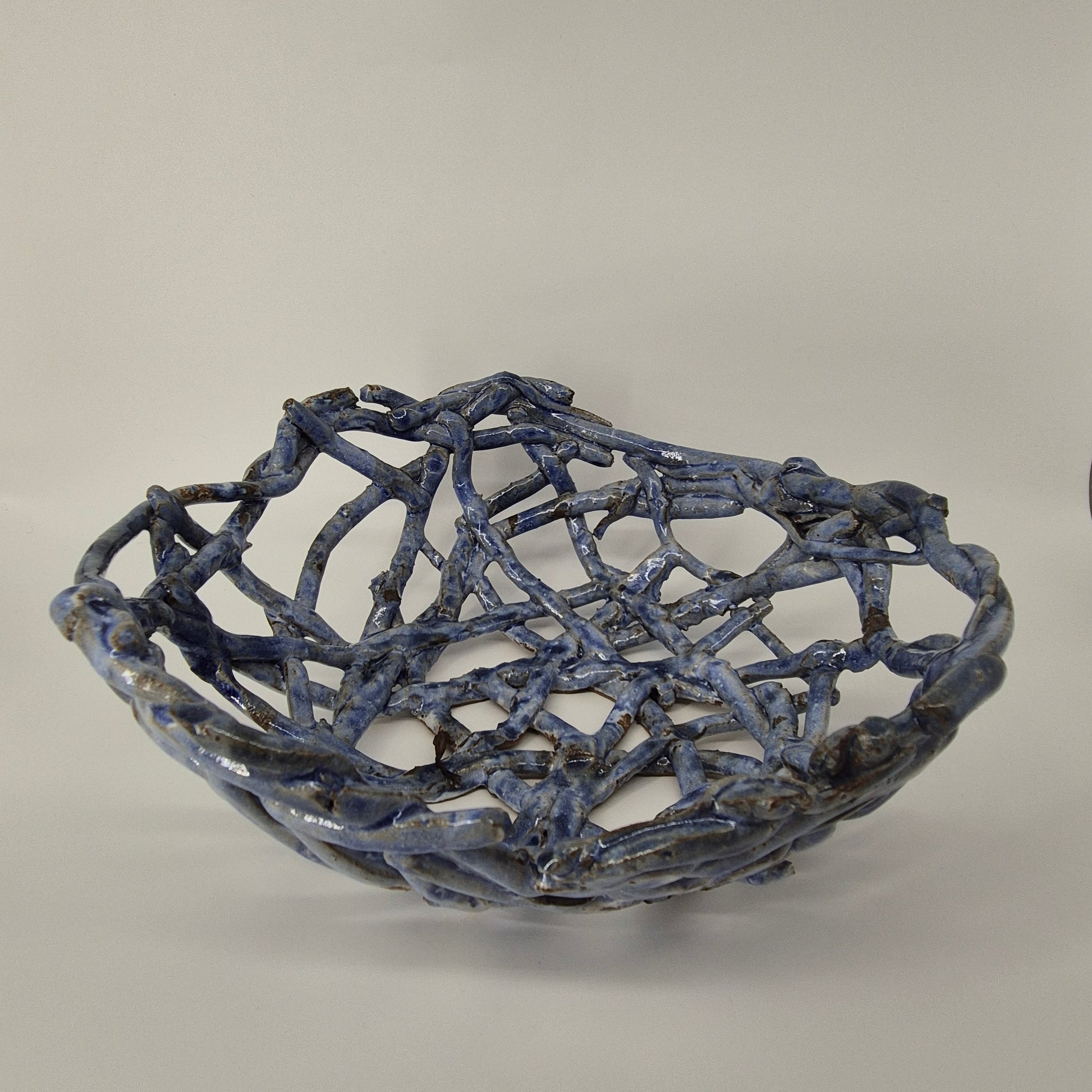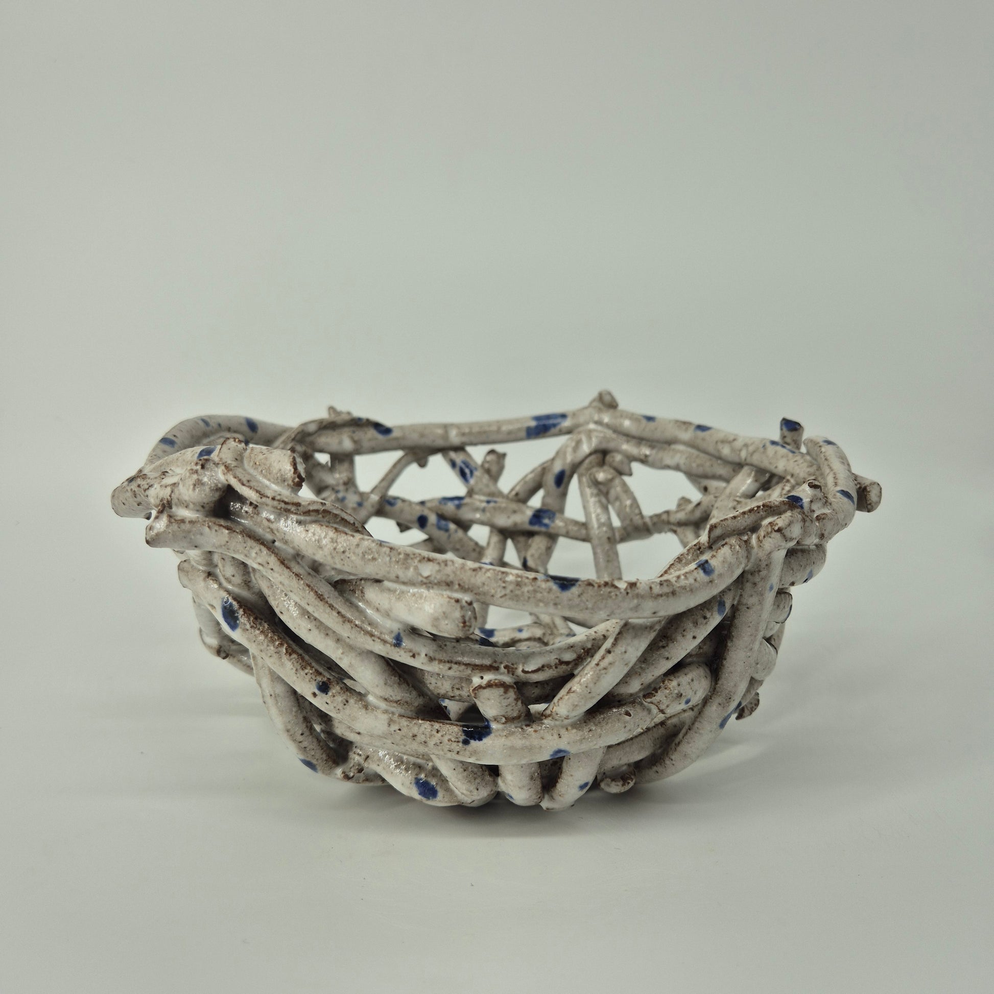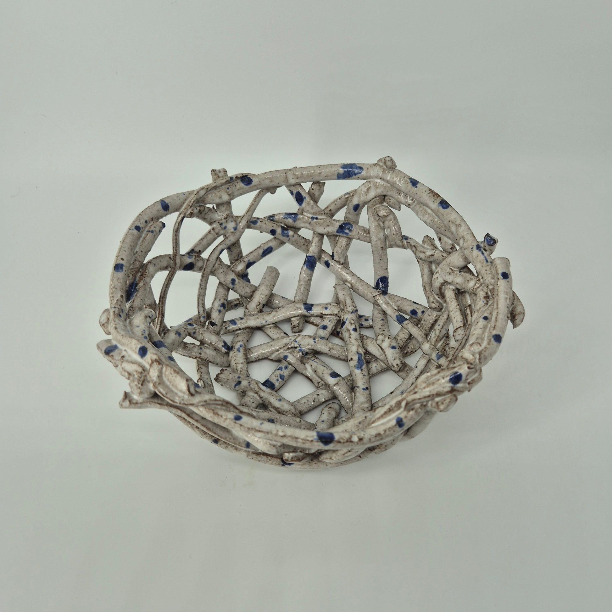 These fruit baskets are inspired by natural forms, including bird's nests and spider's webs. The open design allows for air to flow and keep fruit fresh for longer. Additionally, this design blends the colours of the ceramic with that of the fruit.